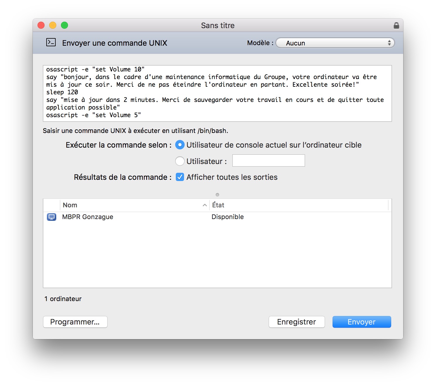 Il est possible de l’envoyer à des tonnes d’ordinateurs via Apple Remote Desktop grâce à la fonction « UNIX » qui permet d’envoyer des lignes de commande :