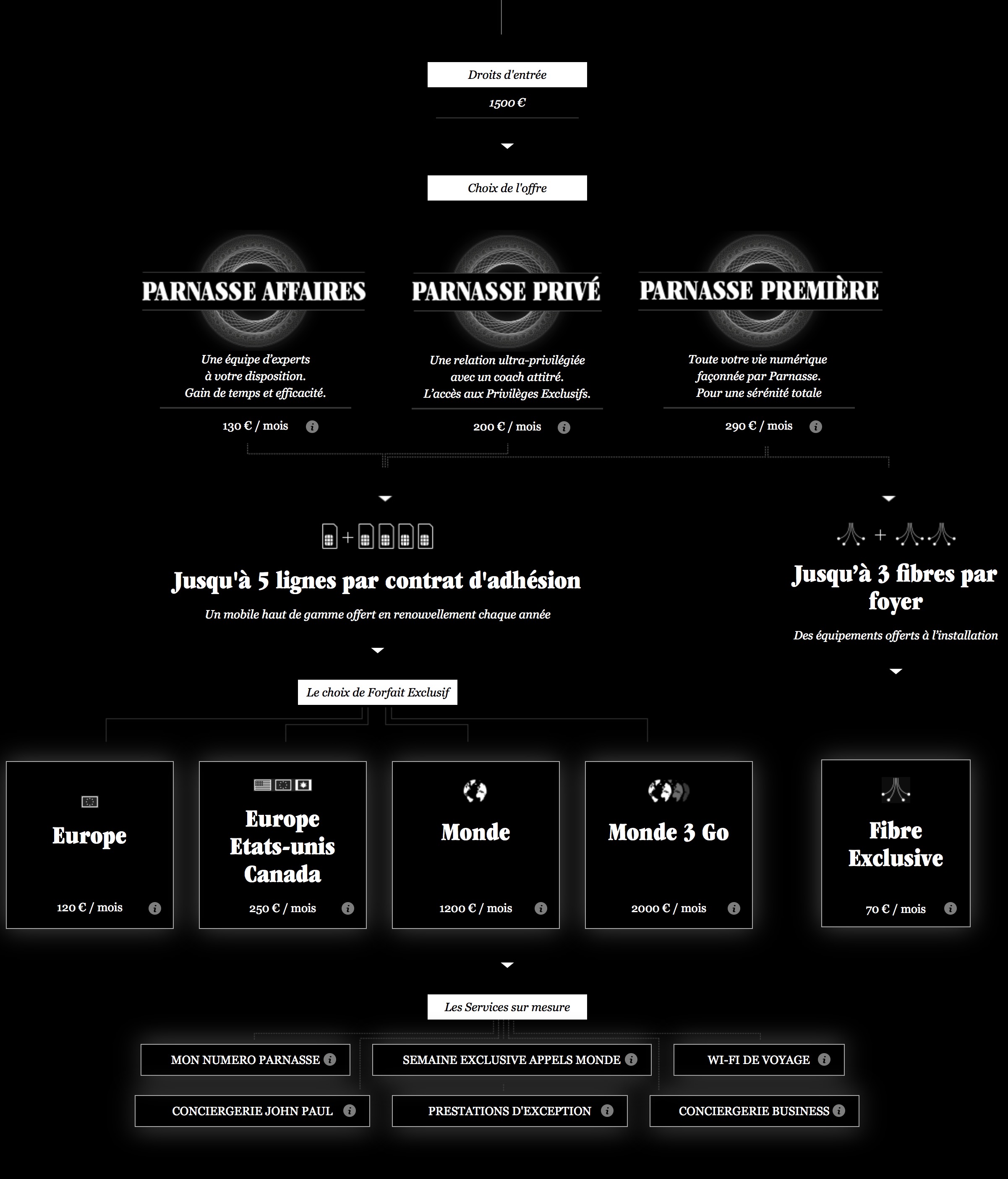 En gros le droit d’entrée est de .. 1500 euros (contre 1000 avant). Le client doit ensuite choisir entre Parnasse Affaires, Parnasse Privé, Parnasse première (130 / 200 / 290 euros par mois) qui sont des offres de services obligatoires avec différents niveaux.